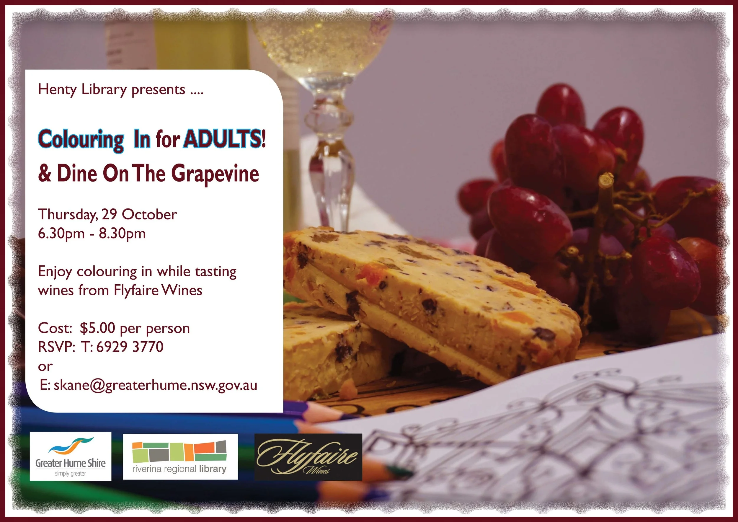This coming 29th of October, the Henty Library is hosting an event at Flyfaire where it's time for the adults to colour in (who said colouring in was just for the kids) and enjoy wine tasting at the same time.